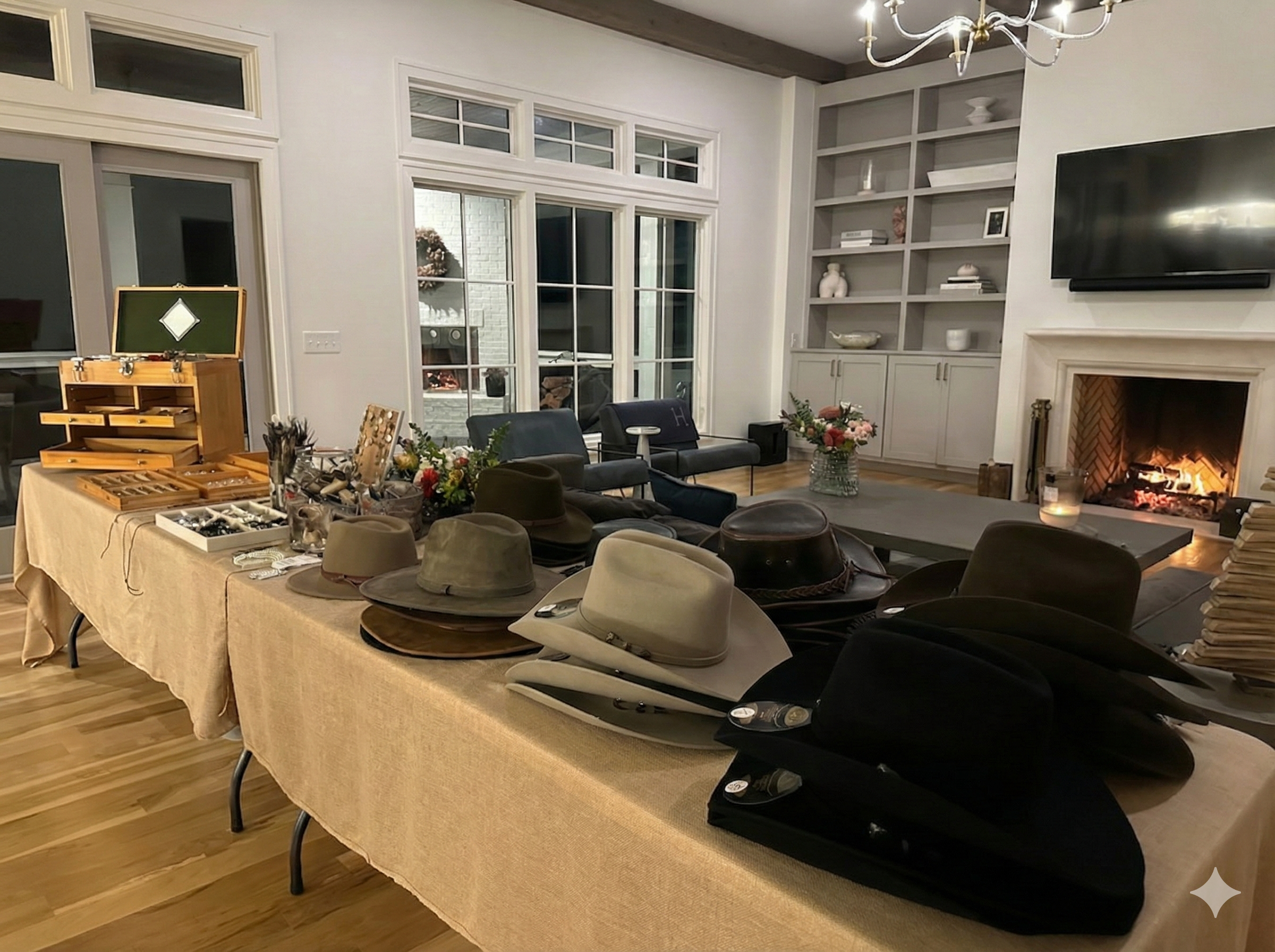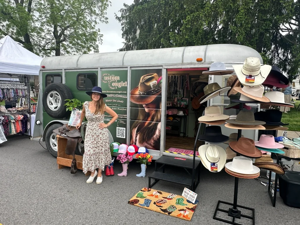 Housed in a charming restored horse trailer studio in Franklin, Tennessee, I tow the mobile workshop to fairs, ranch weddings, company parties, grand openings, and more. And for guests around the world, I host interactive Zoom builds—so they can design custom hats with Nashville roots to match their boots.