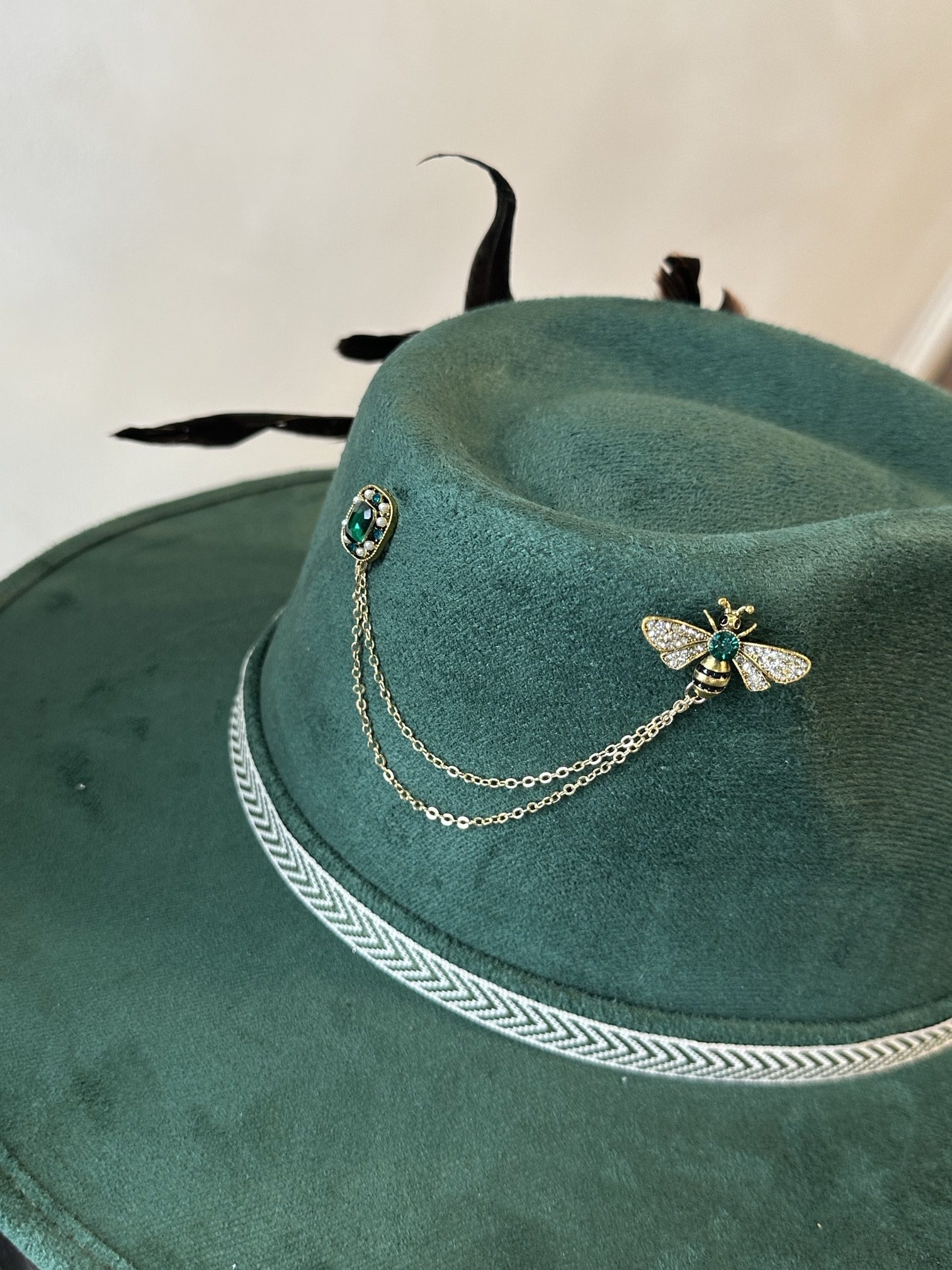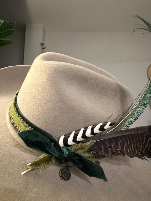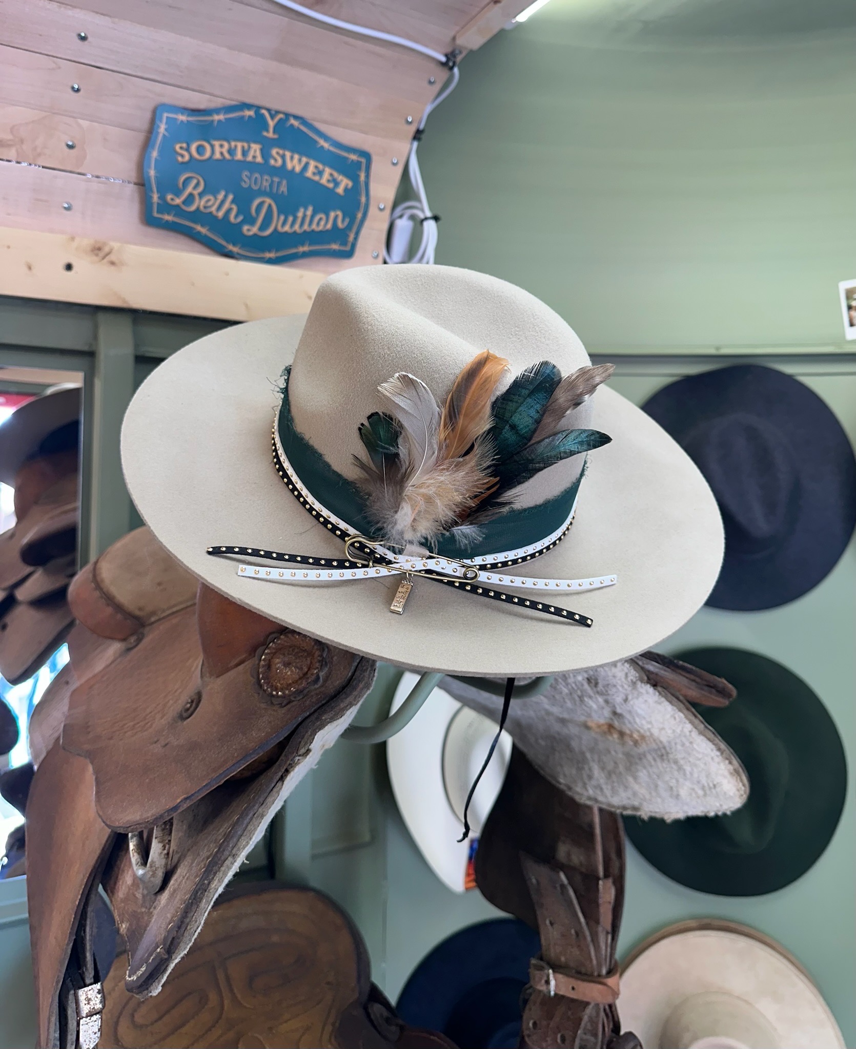 Craft your story through custom accents. Choose from real feathers, glass beads, vintage treasures, and unexpected elements—attached to your crown or brim with precision to enhance your custom crown.