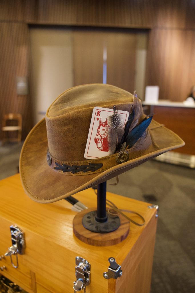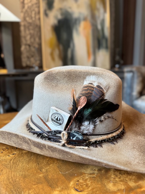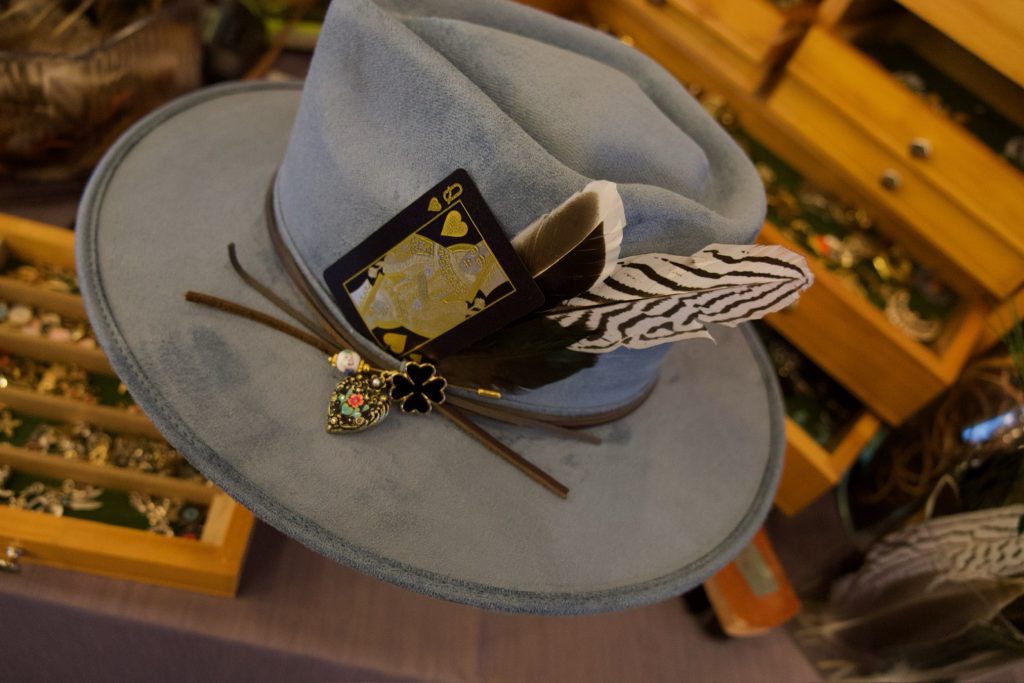 Bands, feathers, hot-iron branding, beads, vintage pieces, hat chains, pins.